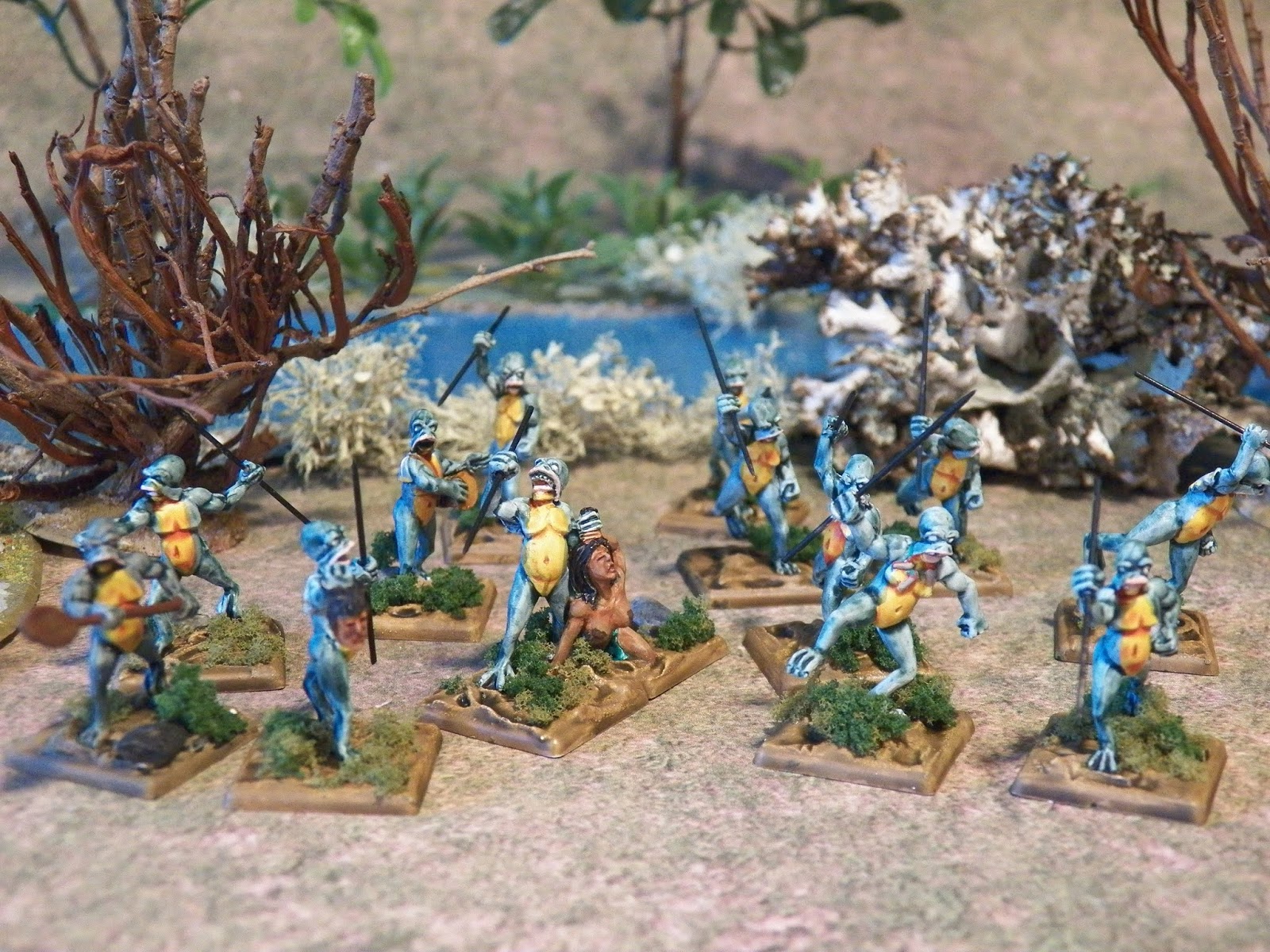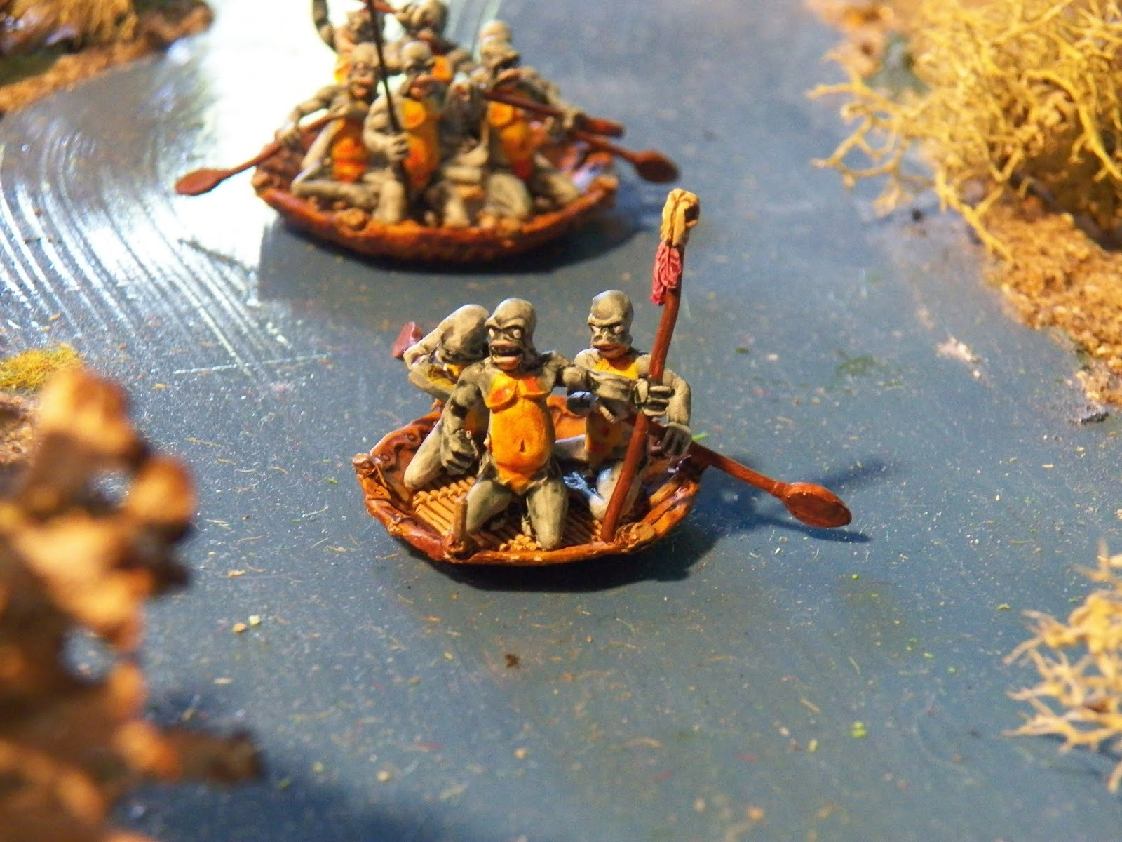 The Hlutrgú are one of the vicious alien races that finds themselves cohabiting Tekumel. They are definitely not friendly, having a fearsome reputation with respect to captives. Fortunately, they are restricted more-or-less to a swampy enclave in south-eastern Tsolyanu. Unfortunately, they occasionally leave their enclave in large flotillas of their little coracles, each packed with the savage creatures.